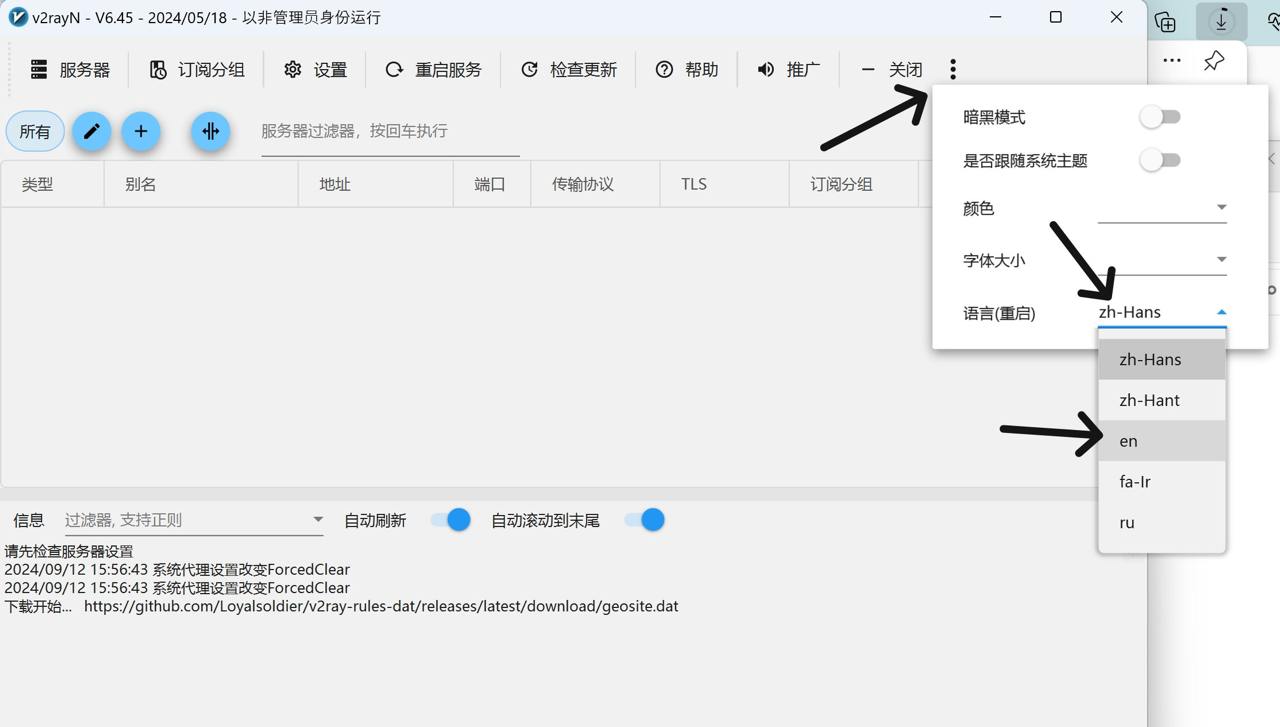 اگر برای اولینبار برنامه رو باز کنید، با زبان چینی روبهرو میشید، برای تغییر زبان سه نقطهٔ بالا سمت راست برنامه رو کلیک کنید و گزینهٔ آخر — "en" رو انتخاب کنید.
